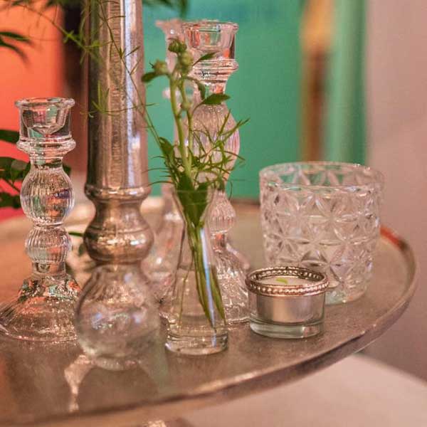 Der er 2 assorterede stager med samme perle sølvkant langs kanten. Den ene er konisk i faconen og den anden er lidt buet med riller på langs af glasset. Fyrfadslys er altid nemme at skifte undervejs, hvis festen fortsætter til langt ud på natten. Har du brug for at skabe lidt god stemning i baren eller andre rum end selve festlokalet, er det også det nemmeste at drysse lidt rigeligt med fyrfadsstager ud på borde og vindueskarme. Måske kan du bare lægge et blomster hoved ved siden af. Helt enkelt og fint.